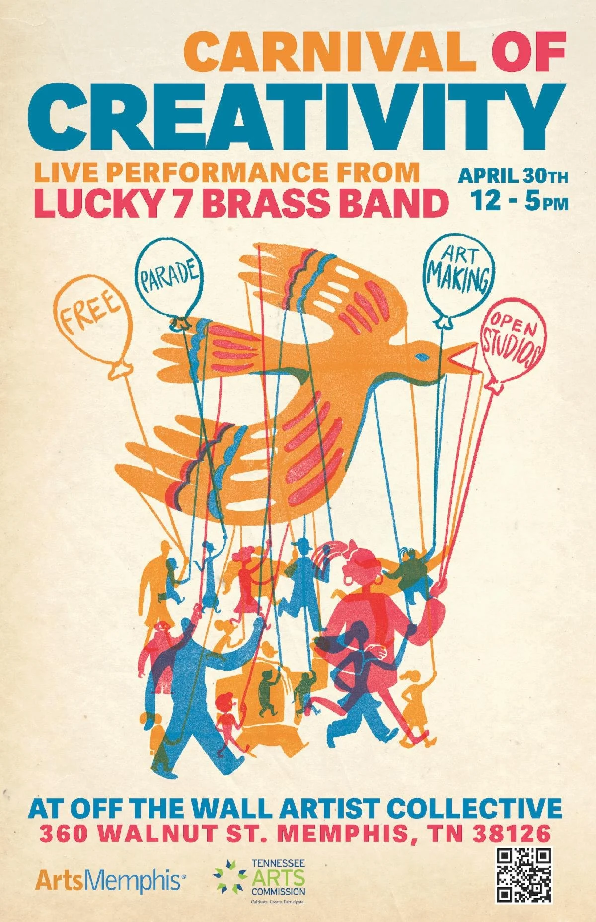 After all of our puppets were finished, we hosted an event at Off The Walls Arts called “CARNIVAL OF CREATIVITY” where students that participated in the workshop, along with the greater artistic community, celebrated the creative process of puppet making with a Giant Puppet Fashion Show and a Giant Puppet Parade! There was also live music by the Lucky Seven Brass Band and dance performances by students from the University of Memphis!